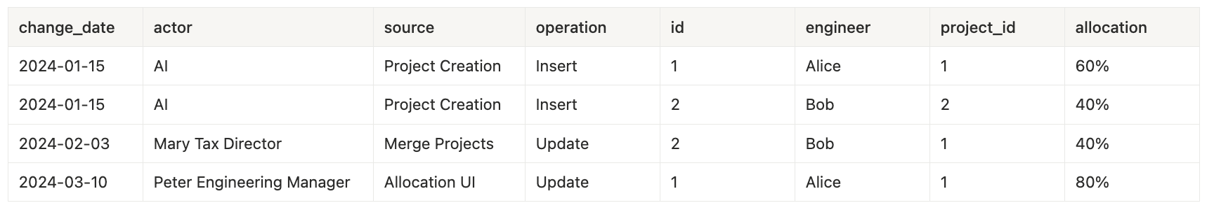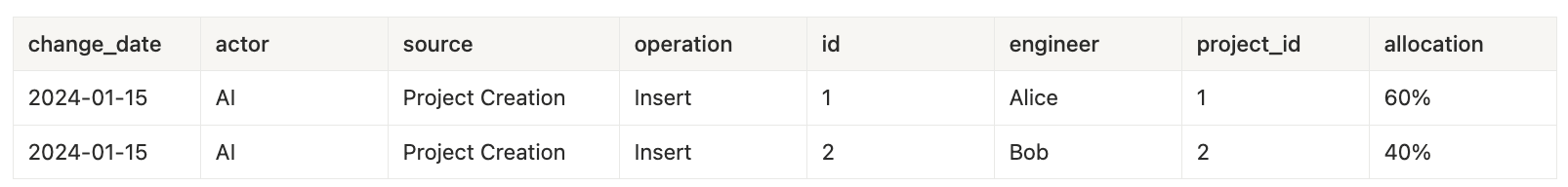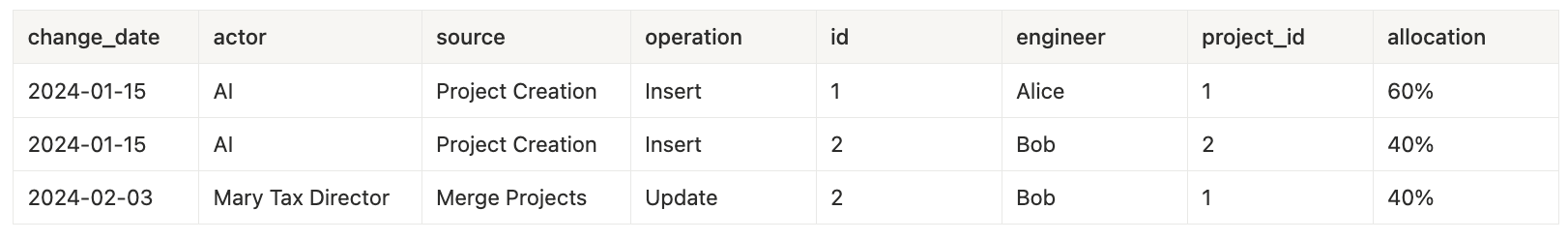 The best way to understand what an Audit Log actually does is to look at a real example. So, let’s suppose we have two tables: one that tracks engineering projects, and a second that tracks how an engineer’s time is allocated.