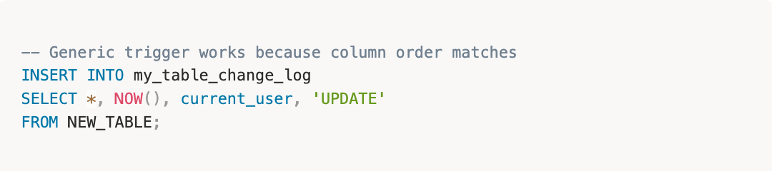 This significantly reduces boilerplate code and makes triggers easier to maintain across hundreds of tables.