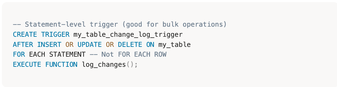PostgreSQL has two trigger types: row-level (fires once per row) and statement-level (fires once per statement). For Audit Logs, use statement-level triggers: