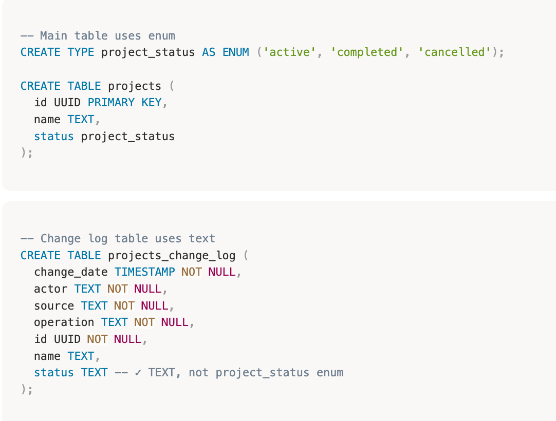 Audit Log tables are append-only archives—they should never block operations on live data. - Convert Enum Types to Text
